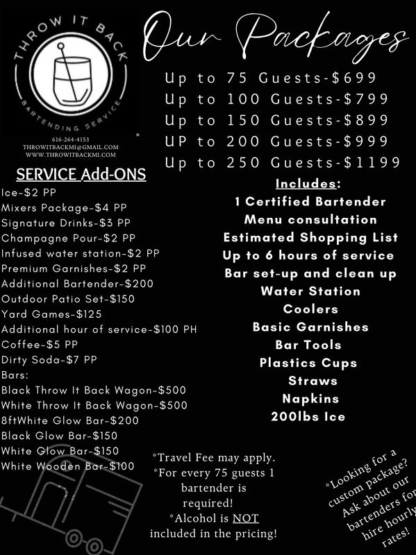 We service all of Michigan! Travel fee waived for Bartending events located in: Grand Rapids, Ada, Allendale, Kentwood, Hudsonville, Byron Center, Cascade, Rockford, Greenville, Wyoming, Wayland, Forest Hills, Jenison.